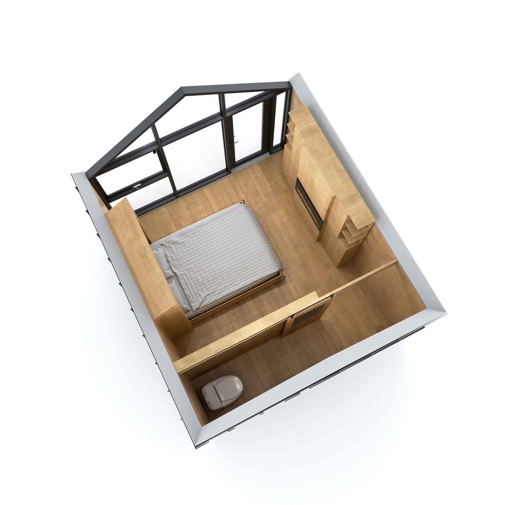 Tiny space to the Max! This larger Monarch model uses extra prefab modules to stretch the standard Monarch to 160 sqft in various US and CDN regions where larger no building permit structures are allowed. This size lets you really let loose on creating your ideal flex space. Optional partition walls with sliding barn door can divide the space up and create a privacy for a composting toilet or extra storage.
