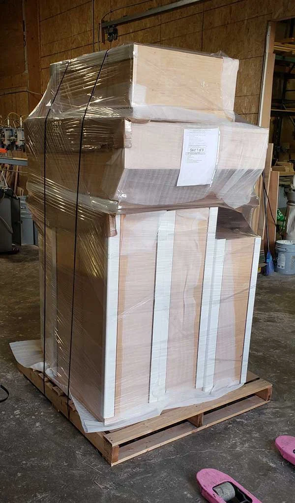 Furniture is packed in custom made boxes and strapped together in groups of 6 cabinets. These are sensitive to weather so store indoors until the Bunkie is weather tight. Be careful when opening boxes with knives and note orientation when removing the cardboard.