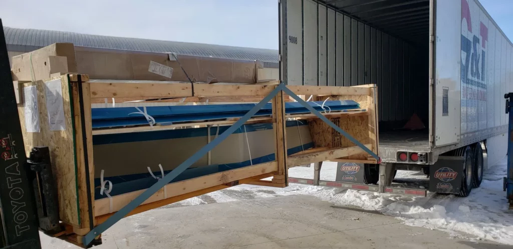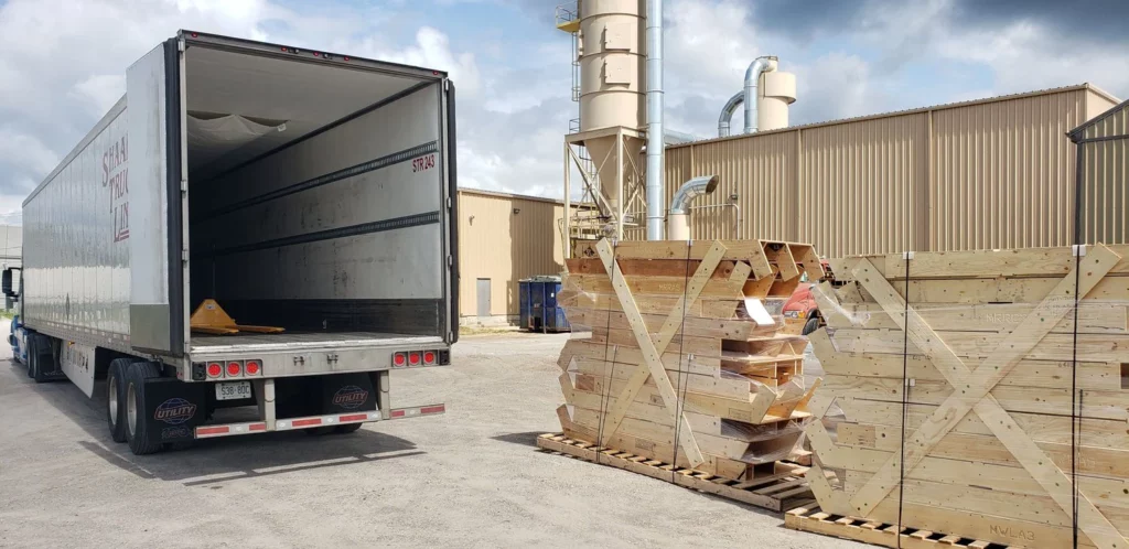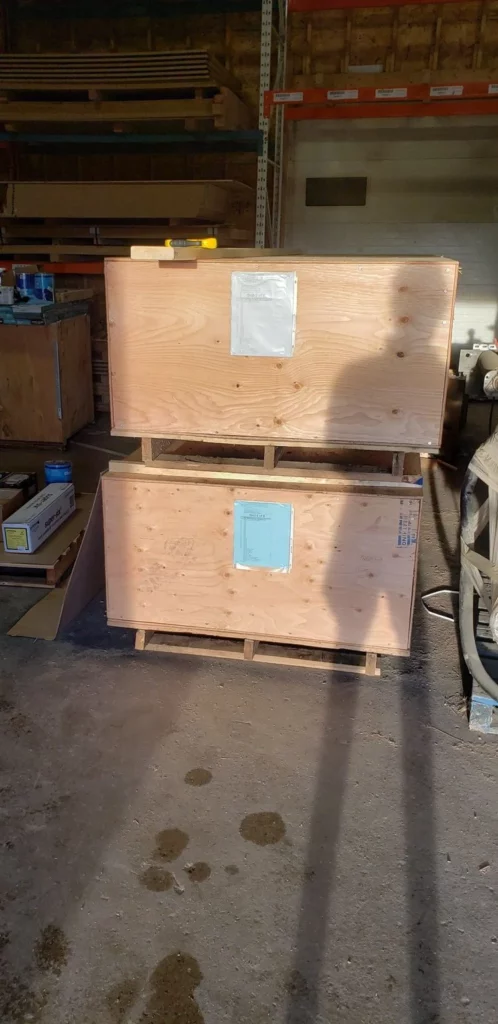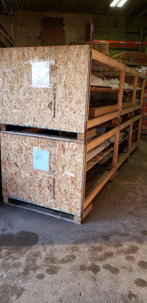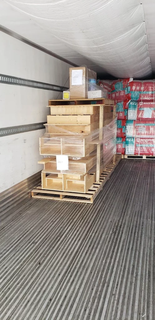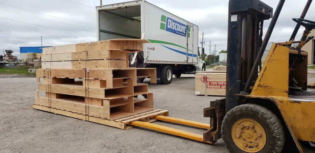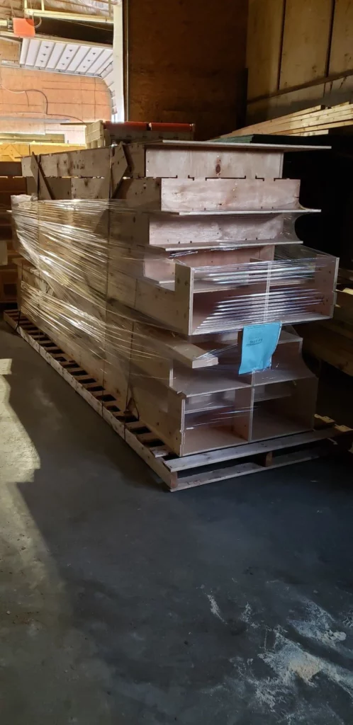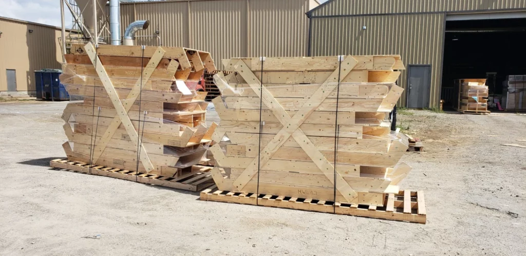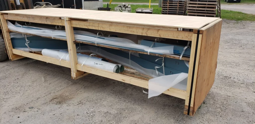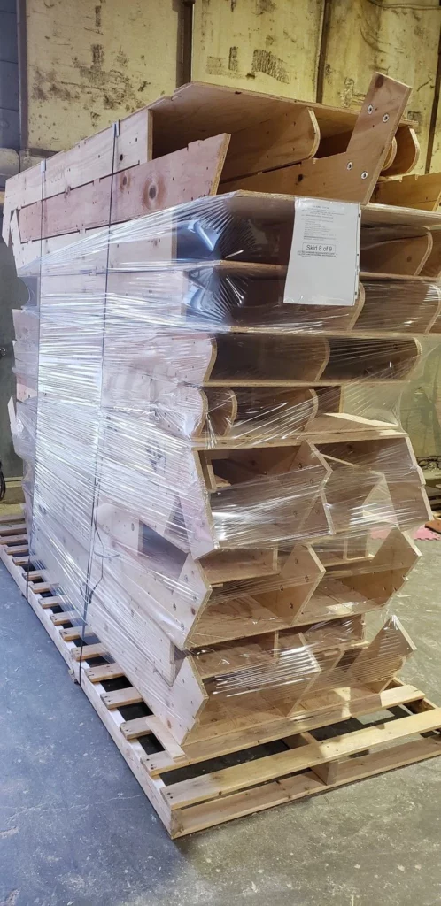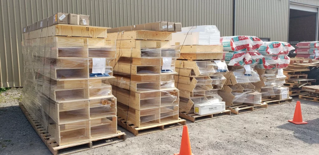 The wood structural frame is delivered on 4’ wide pallets up to 13’ long. They are stacked, strapped and braced for transportation. Tip: Keep the large pallet for on site organization during the build. Only long distance deliveries are plastic wrapped for additional protection.