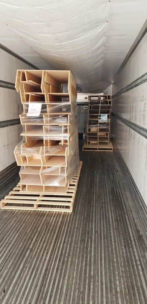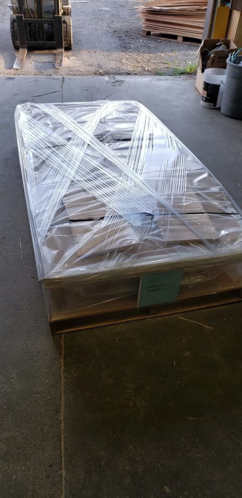 Each interior panel kit is packed on a 4’ x 8’ pallet with thin foam sheets between each piece. They are then trapped and wrapped in a clear protective layer. We often add the rigid foam bundles on top of this type of pallet.