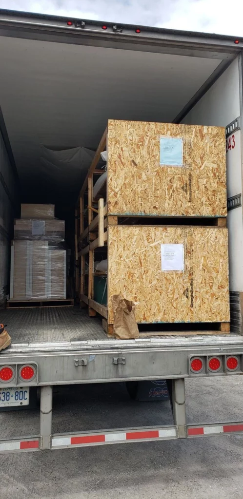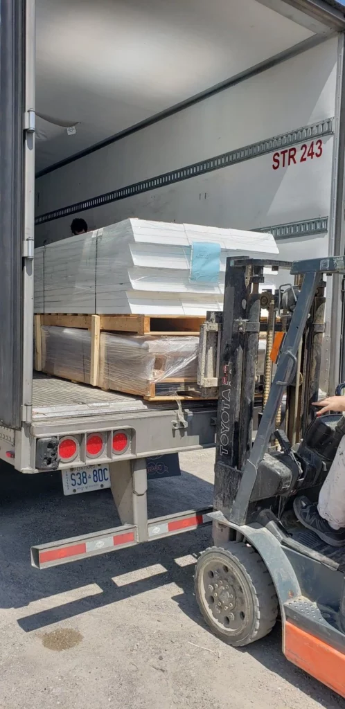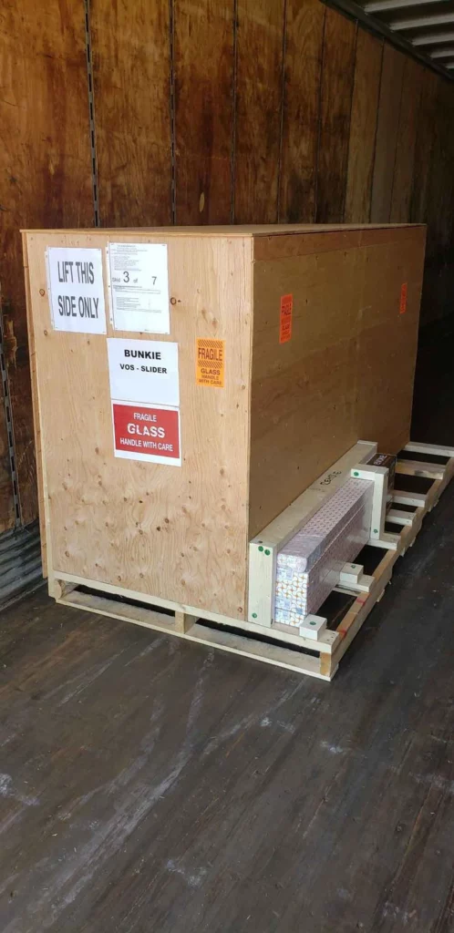 Each curtain wall is packed by our supplier in custom crates 4’ wide and a maximum of 12’ long. The glass is placed inside the aluminum frame for compact and safest transportation. We often attach different materials to these crates to save space in the truck. Local deliveries are sent directly from our supplier.