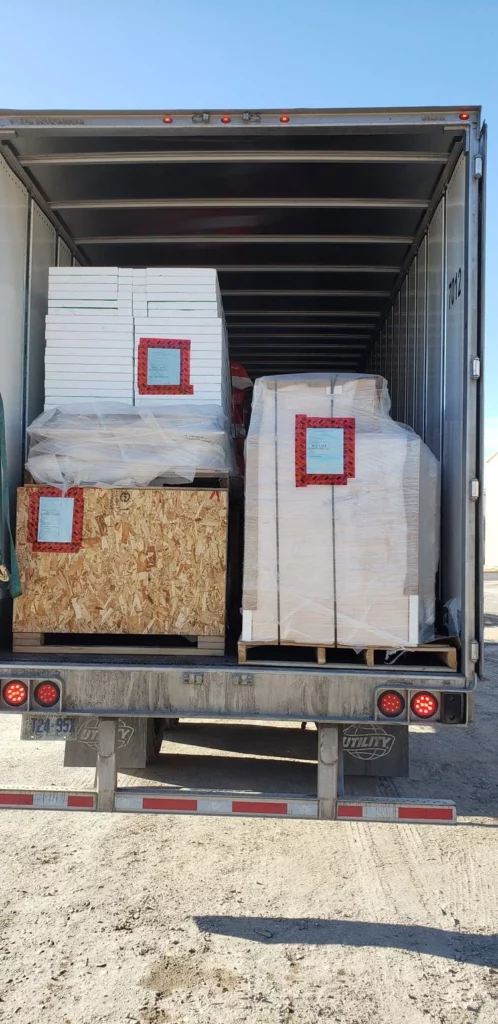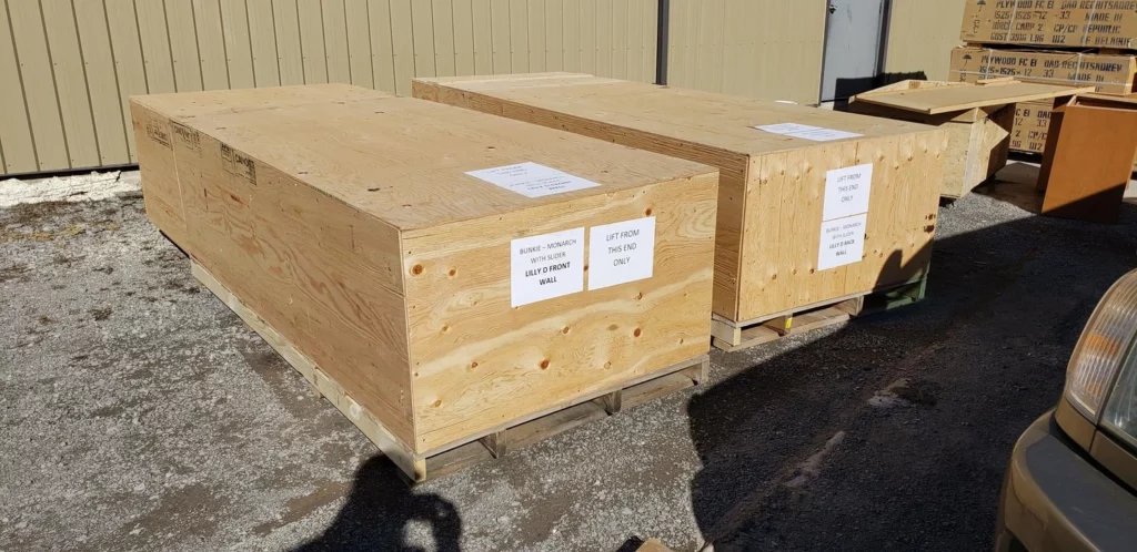 Above are some great examples of what the Bunkies look like during shipping. Most deliveries arrive to site by 26’ straight truck and can be unloaded by 2-3 people in 1-2 hours depending on site conditions. Every pallet or crate has a label to keep track of contents being shipped.